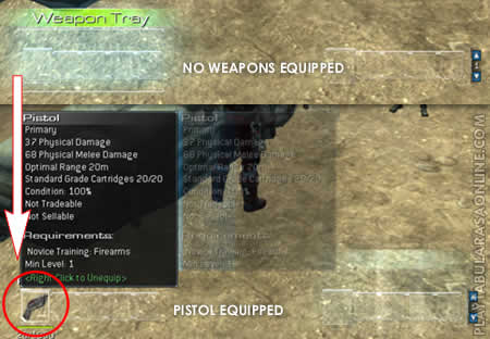 Click and drag the pistol from the equipment inventory bag to the Weapon Tray on the left side of the bottom-center part of the screen. This will equip your pistol. You can holster and unholster your weapons using the "H" key. Alternatively, you can click your mouse fire weapon key (default is mouse button 1) to unholster your weapon.