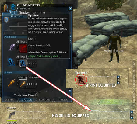 Click and drag the "Sprint" ability from the "Skills" window to the Ability Tray on the right side of the bottom-center part of the screen. This will equip the ability "Sprint".