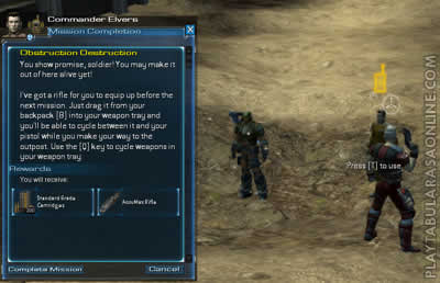 Once you complete the objective, go up to Commander Elvers (he should've moved up further along the path after the battle) to complete the mission. He will give you a rifle and some ammo. Rifles have increased range compared to a pistol...so it will be good for sitting back and hitting mobs from far away.