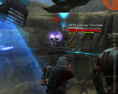 Further up ahead, you will stumble accross an AFS Turret that has been captured by the Bane. You can shoot at it from a distance instead of using your charges to take it out. After you take the turret out, move on forward and you will encounter a red gate. A red gate means that the outpost is in enemy hands, and you need to recapture the point. There is another AFS Turret on the left side of the gate. Take it out and proceed to the red gate, but watch for Bane units.